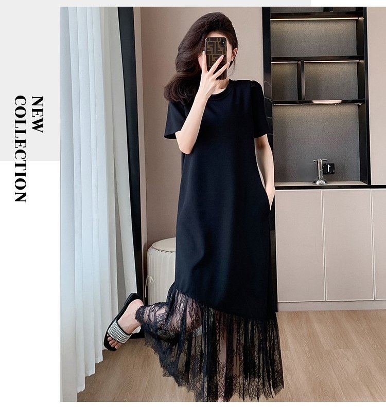 여성 모델의 레이스 패치 루즈핏 원피스 착용샷
